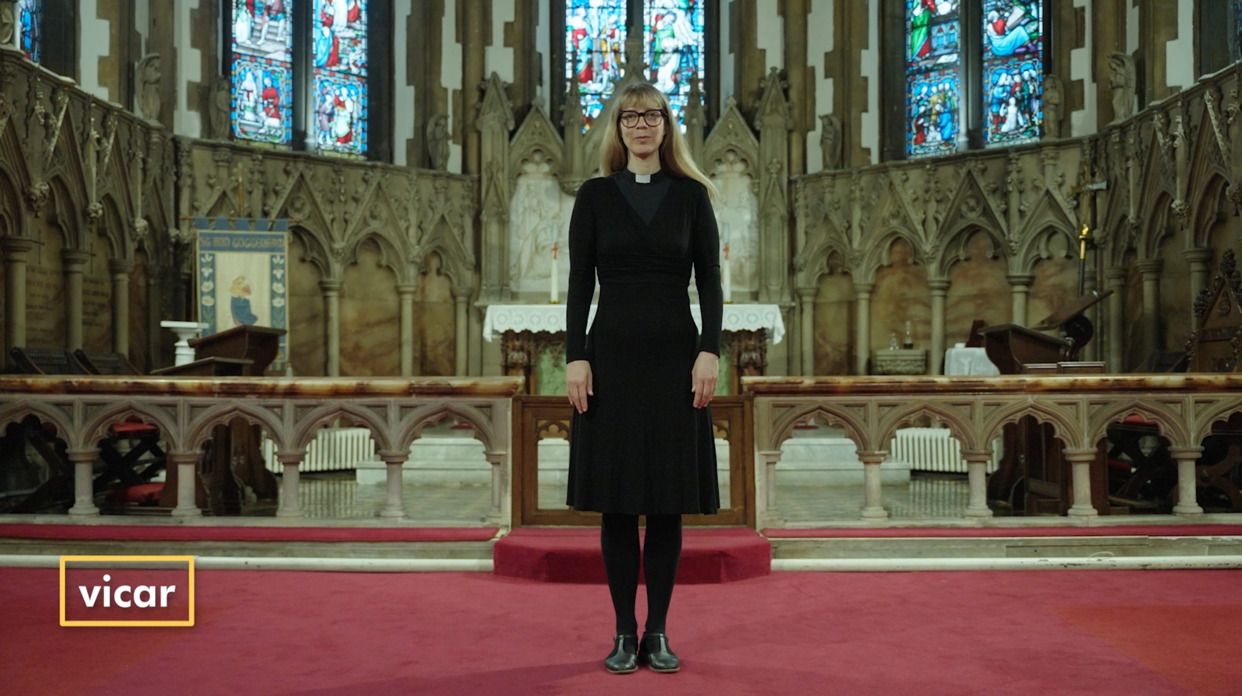 Shanice: Church of England vicars often wear a white collar to let people know who they are and what they do. This is called a clerical collar or a Roman collar, but most people just call it a dog collar because that's what it looks like. For church services, a vicar often wears special clothes called vestments, which make every service and occasion. Over her everyday clothes, the vicar wears a long black gown or coats called a cassock. This is a sort of uniform that vicars and priests have worn for centuries. Over that, she wears a white gown called a surplice, and that's a symbol of purity. Around her neck, she wears a long scarf called a stole, and that's to show that she is an ordained priest. In other words, she's done all the training, had some experience, and is blessed by God to serve his people. The vicar wears different colour stoles at different times of the year. Most of the time it's green. But she wears a purple one during Lent, which is the time leading up to Easter. And Advent, which is the time leading up to Christmas. On Easter Day and Christmas Day, she wears a white stole and she'll wear that for weddings and funerals as well. There's also a red or brightly coloured one to wear on a festival called Pentecost and at other special occasions. But she's most comfortable like this.